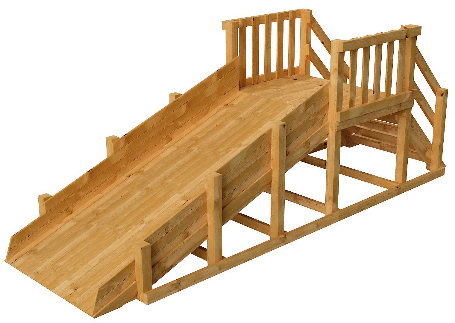 Ширина спуску не повинна бути меншою за 800 мм — це стандартний розмір дитячої гірки з дерева. Оптимальна довжина дорівнює подвоєній висоті майданчика. По обидва боки прикріплюють стругані дошки, які будуть служити бортиками. Для надійності нижню частину спуску можна з’єднати дошками або тонким брусом із опорними стовпами.